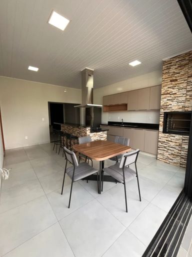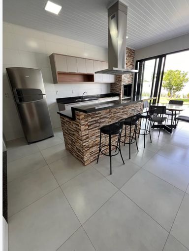 Cozinha: Armários planejados, ilha com cooktop, 3 banquetas, jogo de mesa com 4 cadeiras, coifa e geladeira